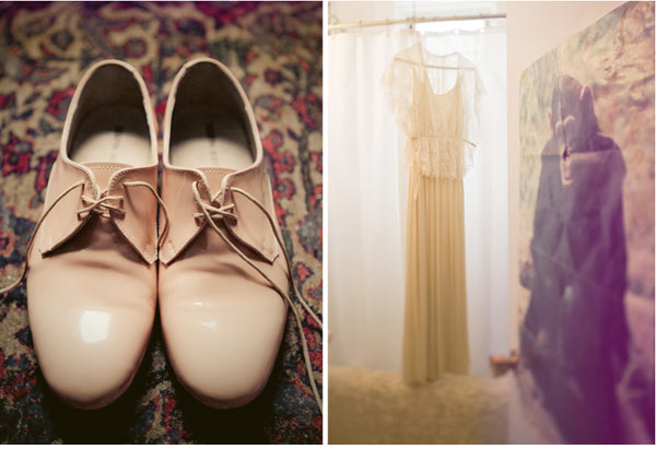 "My dress was borrowed from a friend who was a stylist for many years, the coat was also borrowed from this friend, the gloves were vintage and a gift. My shoes are Dieppa Restrepo (lindos...!), unisex handmade shoes by two young Colombian/New Yorker designers. My bracelet is by Aesa (Randi Mates), a close friend and amazing jewelry designer, who also made us our rings. I bought the flowers for my bouquet at the flower market in Chelsea and two of my best friends put it together. The locations are my friend’s Randi and Gregory’s apartment in Brooklyn, City Hall and the Chelsea Hotel. Mike wore clothes found at various thrift stores, and Spanish handmade boots we’d bought this summer while in Andalucia.